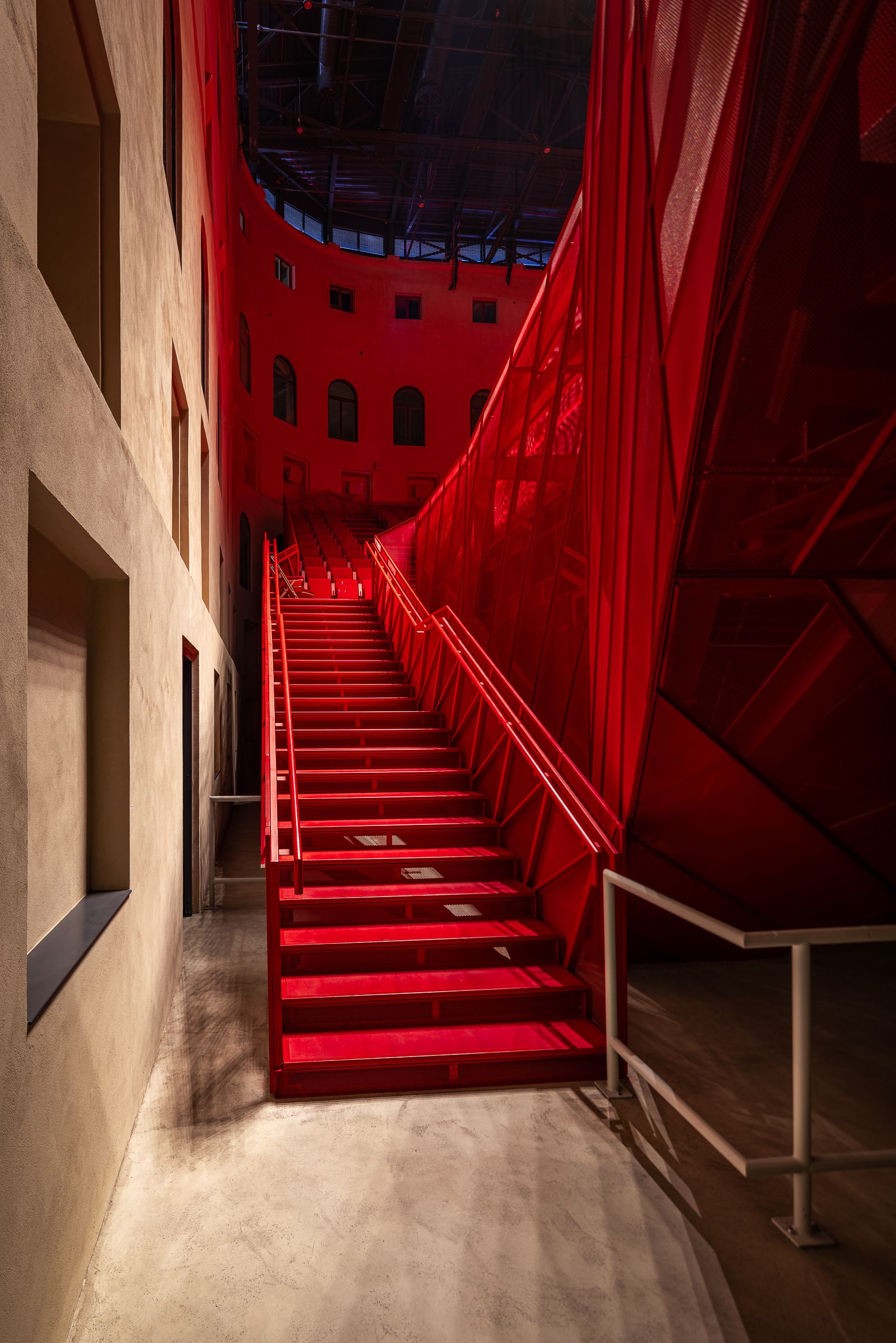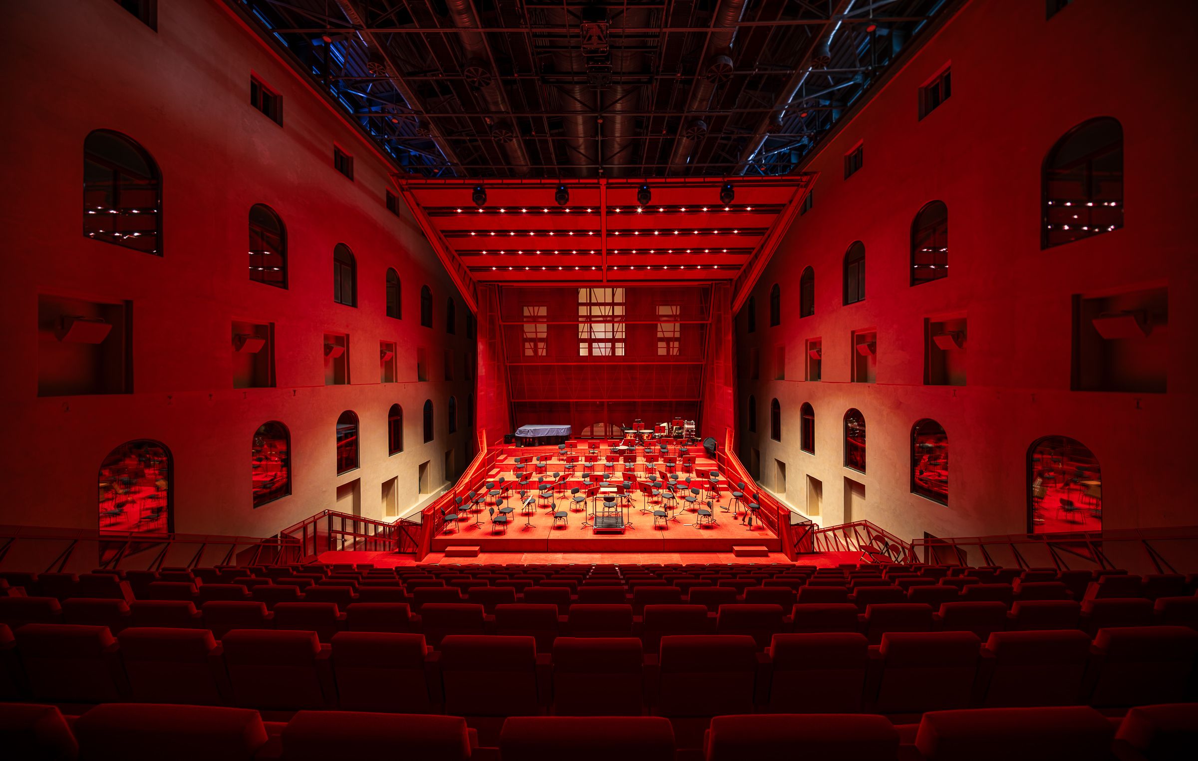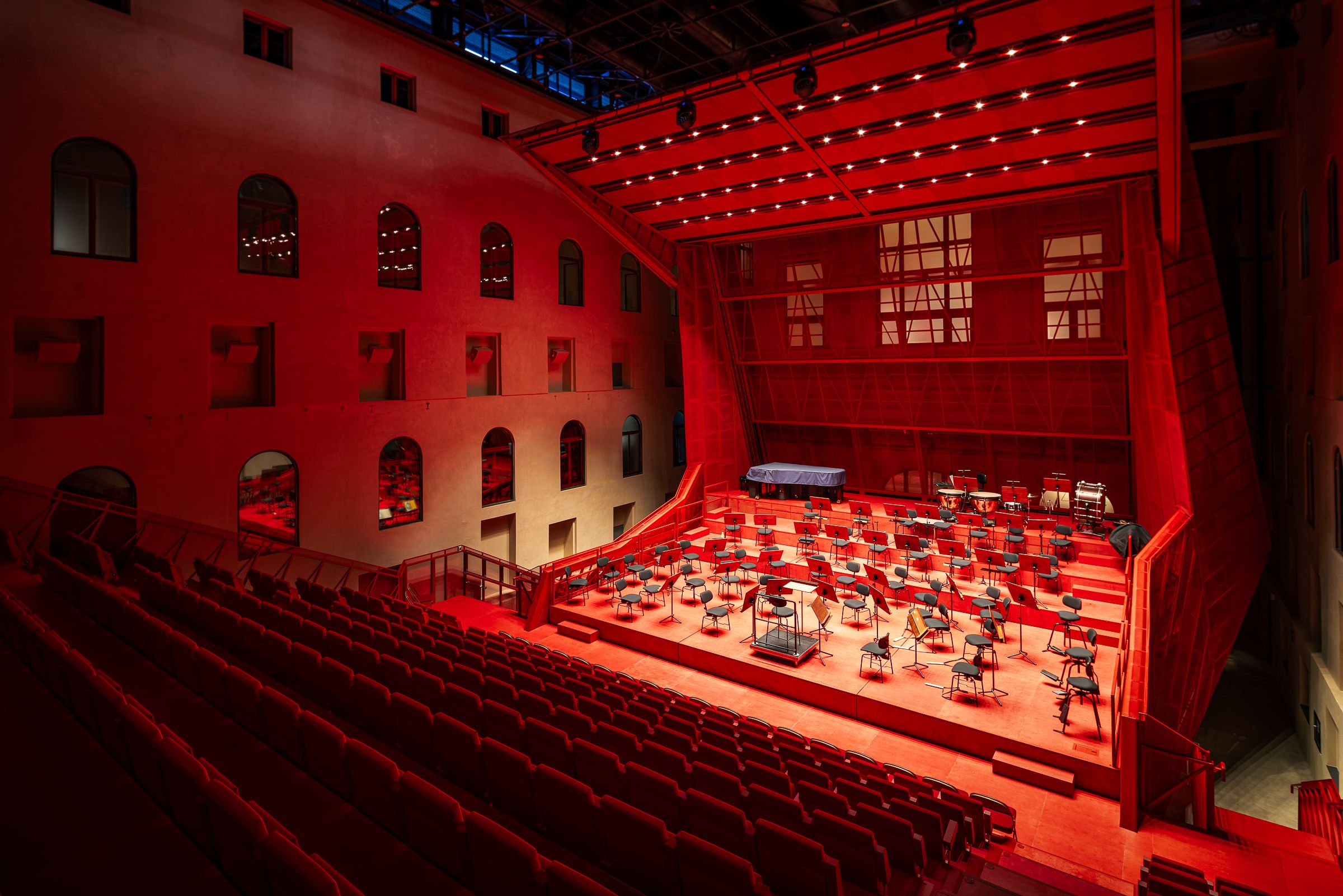 Vestavěná konstrukce stojí na šesti bodových základech z mikropilot a umožňuje různé úrovně konfigurace jeviště a hlediště. Díky specifickému systému elevace lze sál během krátké doby upravit pro symfonický orchestr, filmové představení, či kongresy.